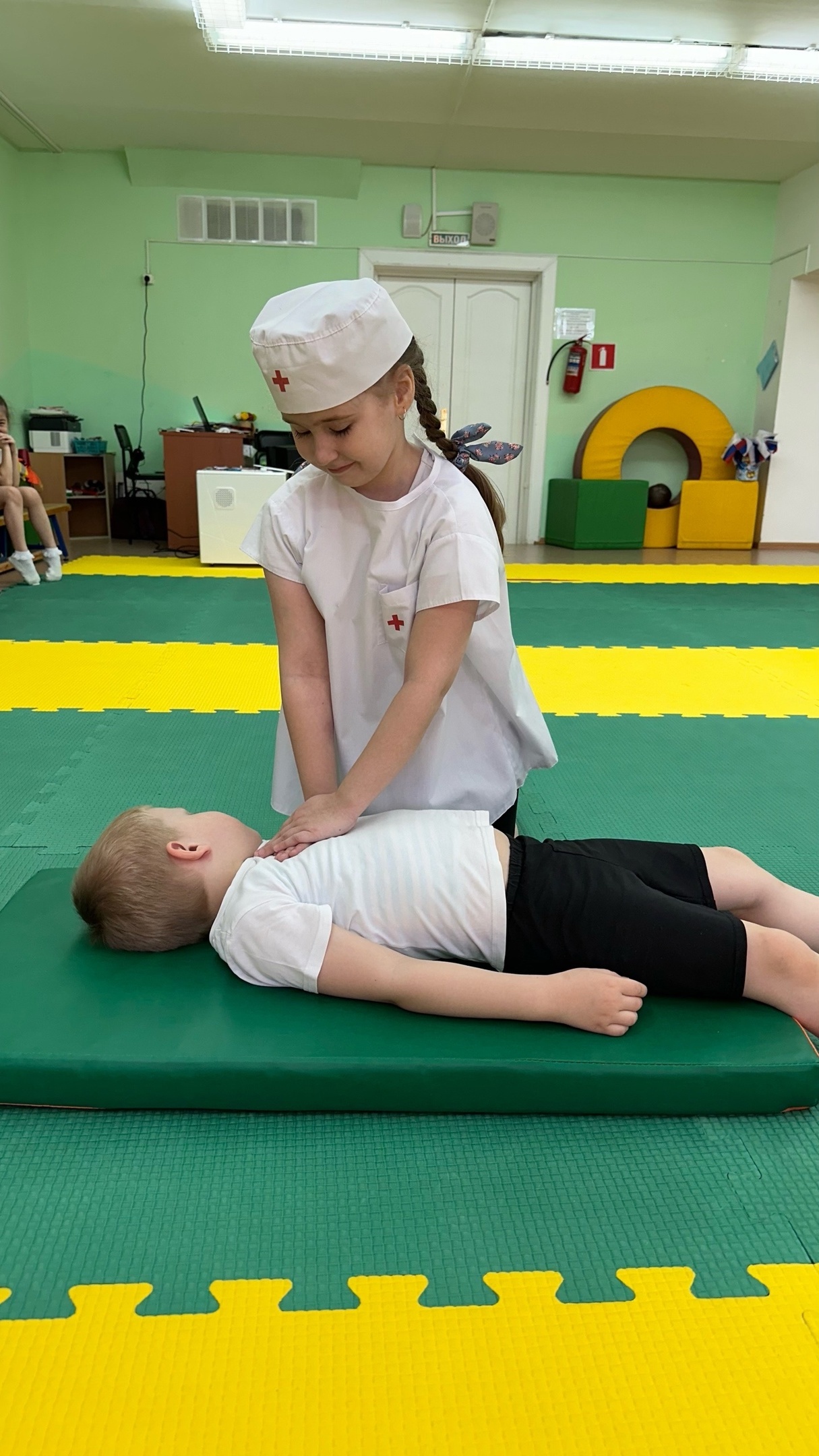 Воспитанники группы № 9 в начале вспомнили профессии людей приходящих на помощь первыми (пожарные, спасатели, полицейские, военные). Затем свои знания дети использовали в тушении пожара, массаже сердца в ходьбе строевым шагом и в игре ПДД. Спортивное развлечение было направлено на развитие волевых качеств и стремление выполнять задание быстро и точно. Мероприятие получилось захватывающим и забавным, оставило массу положительных эмоций и впечатлений.